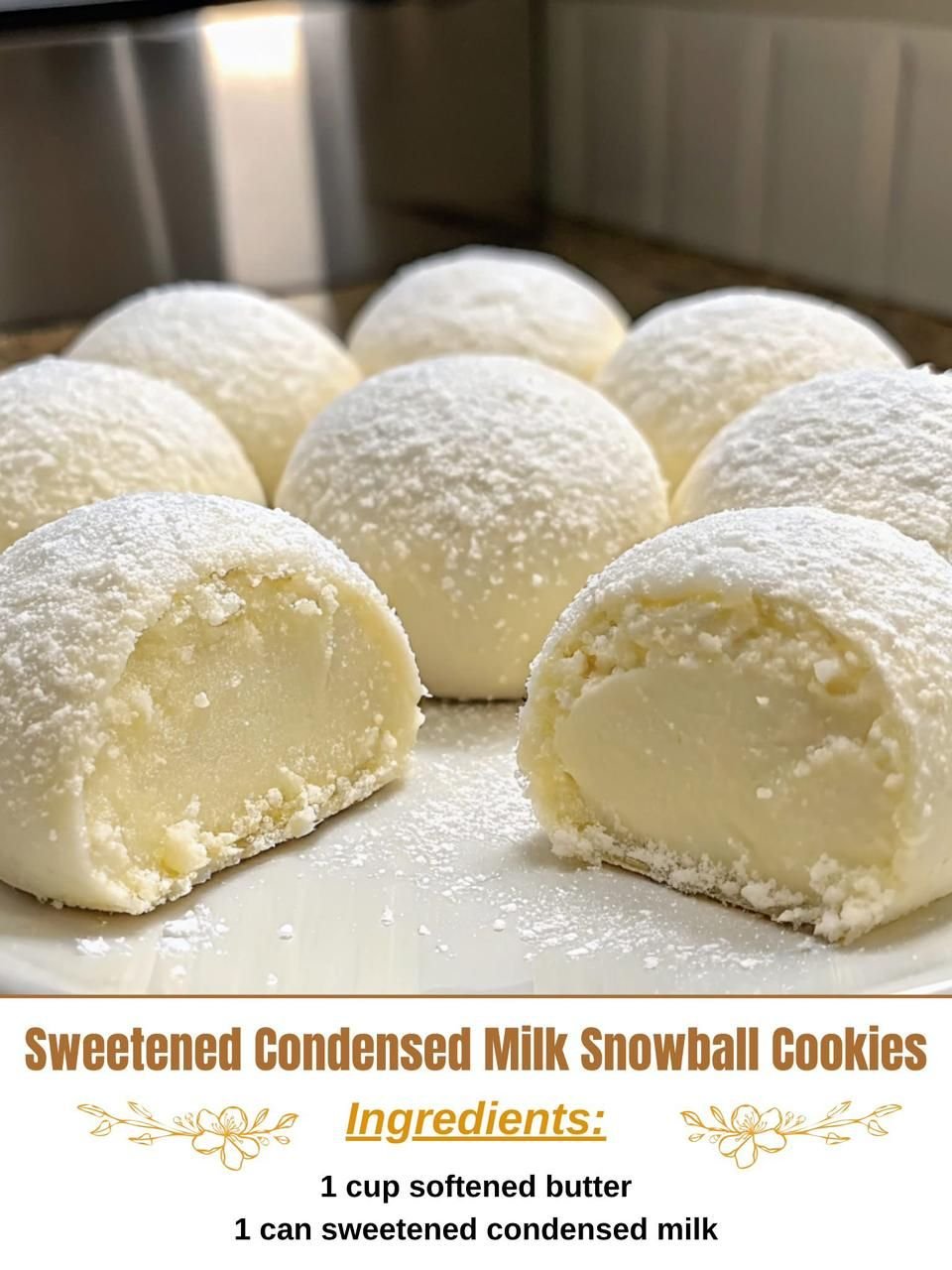 Snowball cookies are classic, nostalgic treats known for their melt-in-your-mouth texture and delicate powdered-sugar coating. This version adds a delightful twist by incorporating sweetened condensed milk, giving the cookies a richer, creamier flavor and a softer, more tender crumb. These cookies require only a few simple ingredients, come together quickly, and bake into little buttery bites that practically dissolve on the tongue. Whether you’re preparing them for the holidays, a gathering, or simply craving something sweet, these snowball cookies bring warmth and joy to any moment.